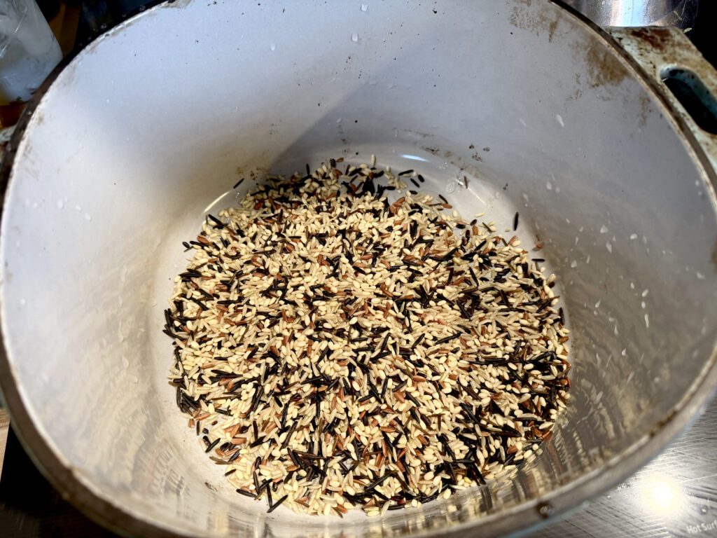 - In your pot, combine wild rice blend, and chicken broth. Heat until boiling and then reduce heat to simmer for 10-15 minutes (until rice is tender)