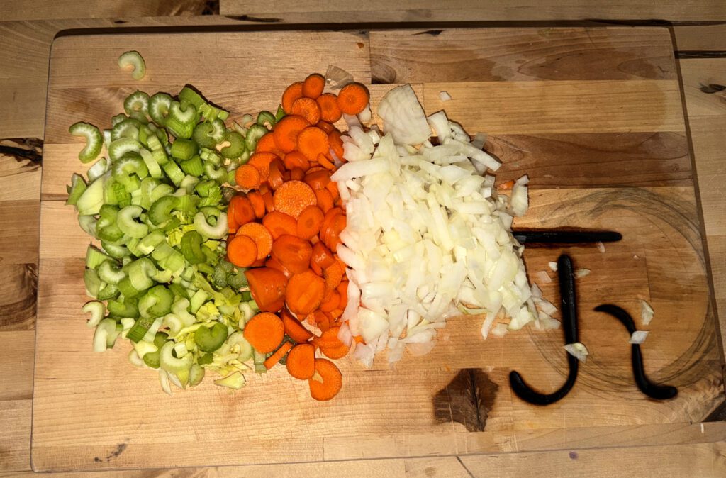 Step 2: While that is heating up, chop up your carrots, celery, and onion. (Garlic too if using fresh) Put them in a frying pan with two tablespoons of butter and sauté them until they are soft.