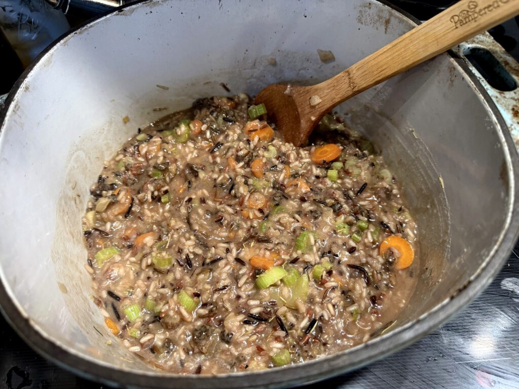 Step 5: Once your veggies are done, and the rice has been simmering for 10-15 minutes, it’s time to add the veggies to the pot with the rice. Mix well, and it will start to thicken almost instantly.